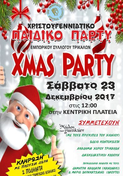 Ο Εμπορικός Σύλλογος Τρικάλων προσκαλεί μικρά και μεγάλα παιδιά στην Χριστουγεννιάτικη εκδήλωση που διοργανώνει για 4η συνεχόμενη χρονιά, στην Κεντρική πλατεία, το Σάββατο 23 Δεκεμβρίου 2017, στις 12:00.
