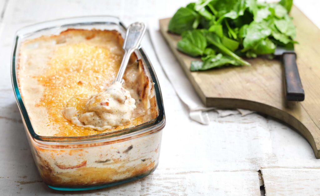Βγάζουμε τις πατάτες με τρυπητή κουτάλα και τις βάζουμε σε λαδωμένο πυρίμαχο, βαθύ σκεύος.