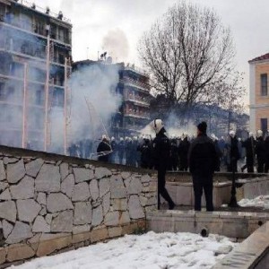 Ακολούθησαν συμπλοκές μεταξύ ΜΑΤ και αντιεξουσιαστών και η περιοχή μετατράπηκε σε λίγα δευτερόλεπτα σε πεδίο μάχης. Οι αντιεξουσιαστές επιτέθηκαν με καδρόνια και ρόπαλα και τα ΜΑΤ απάντησαν με δακρυγόνα και κρότου λάμψης, με αποτέλεσμα η ατμόσφαιρα στο σημείο να γίνει αποπνικτική.