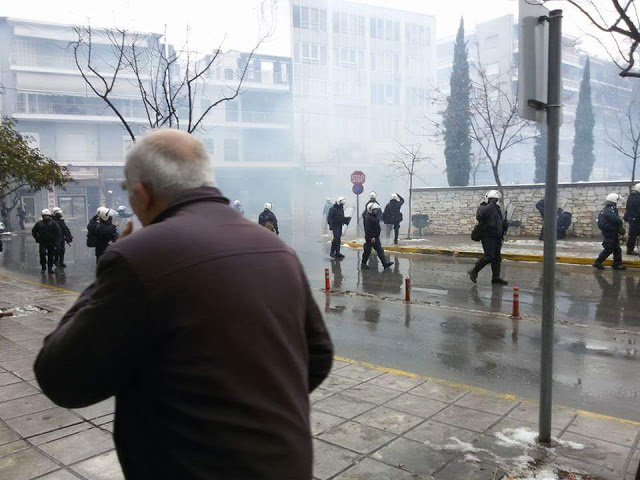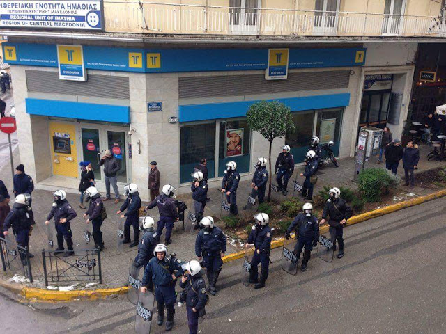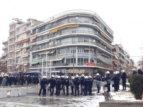Συγκεκριμένα, στις 10 το πρωί, άτομα του αντιεξουσιαστικού χώρου συγκεντρώθηκαν στην πλατεία Ωρολογίου, ακριβώς απέναντι από τα γραφεία, ενώ ισχυρότατες δυνάμεις των ΜΑΤ παρατάχθηκαν όχι μόνο μπροστά στην είσοδο αλλά και κατά μήκος της Μητροπόλεως.
