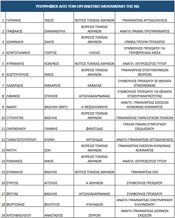 Ενόψει αυτών των ανακοινώσεων η ΝΔ δημοσιοποιεί από σήμερα σε ποιες περιφέρειες θα πολιτευθούν στις επικείμενες εθνικές εκλογές όλα τα στελέχη της που είχαν μέχρι σήμερα θέσεις ευθύνης στο κεντρικό οργανωτικό σχήμα της ΝΔ.