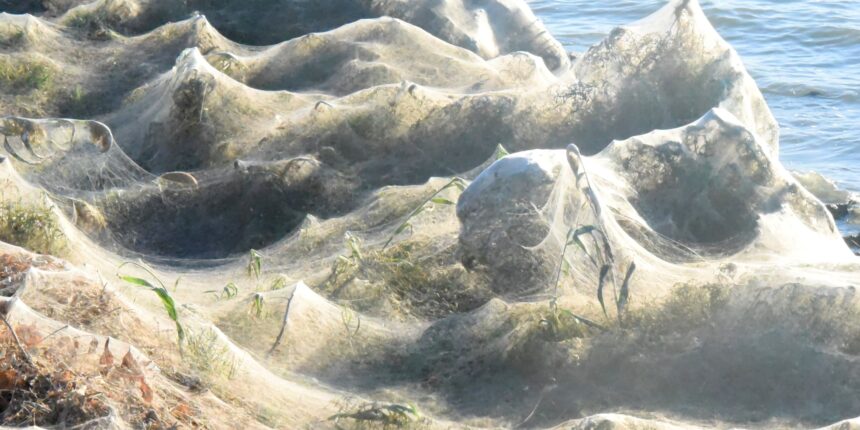Για ακόμη μια χρονιά εντύπωση προκαλεί στο Αιτωλικό και συγκεκριμένα στην ανατολική παραλία της λιμνοθάλασσας το τεράστιο πέπλο από αράχνες που έχει καλύψει τα φυτά σε μήκος 300 μέτρων.