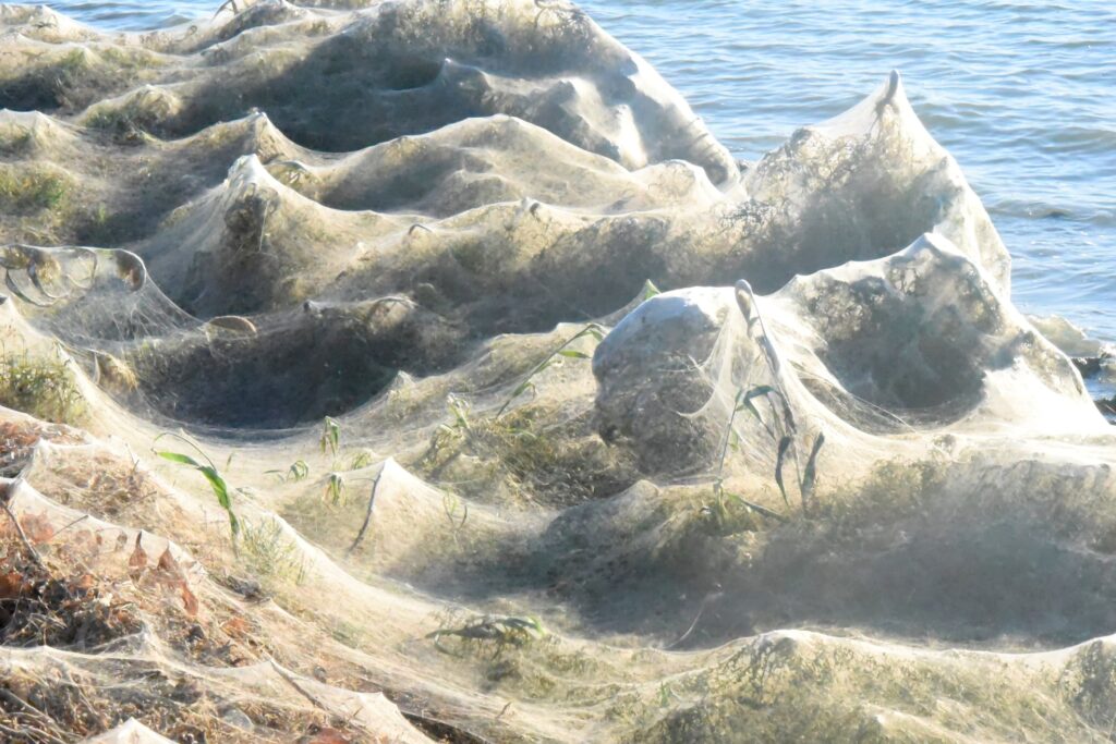 Για ακόμη μια χρονιά εντύπωση προκαλεί στο Αιτωλικό και συγκεκριμένα στην ανατολική παραλία της λιμνοθάλασσας το τεράστιο πέπλο από αράχνες που έχει καλύψει τα φυτά σε μήκος 300 μέτρων.