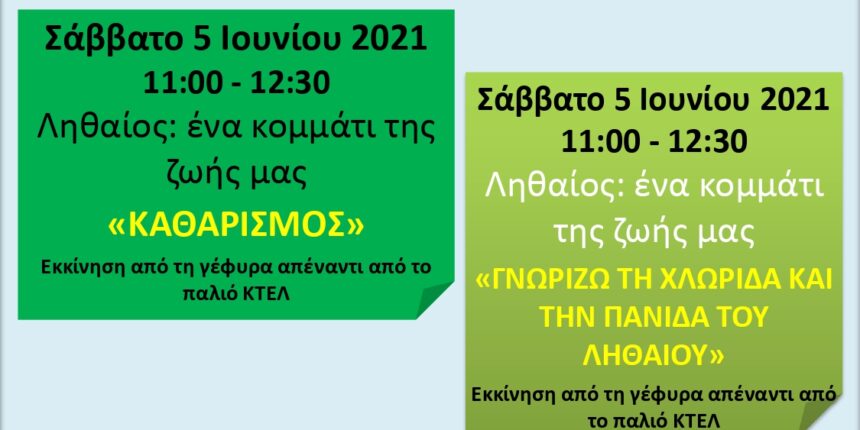 Τα ΚΔΑΠ ΜΑΘΗΣΗ στα πλαίσια της Παγκόσμιας Ημέρας Περιβάλλοντος και των πολύπλευρων δράσεων που απαρτίζουν το πρόγραμμα «ΠΕΡΙΒΑΛΛΟΝΤΙΚΗ ΕΚΠΑΙΔΕΥΣΗ», διοργανώνουν το Σάββατο 5 Ιουνίου 2021 στις όχθες του Ληθαίου ποταμού, ώρα 11:00 – 12:30, καθαρισμό των οχθών του ποταμού καθώς και εκπαιδευτικές δράσεις.