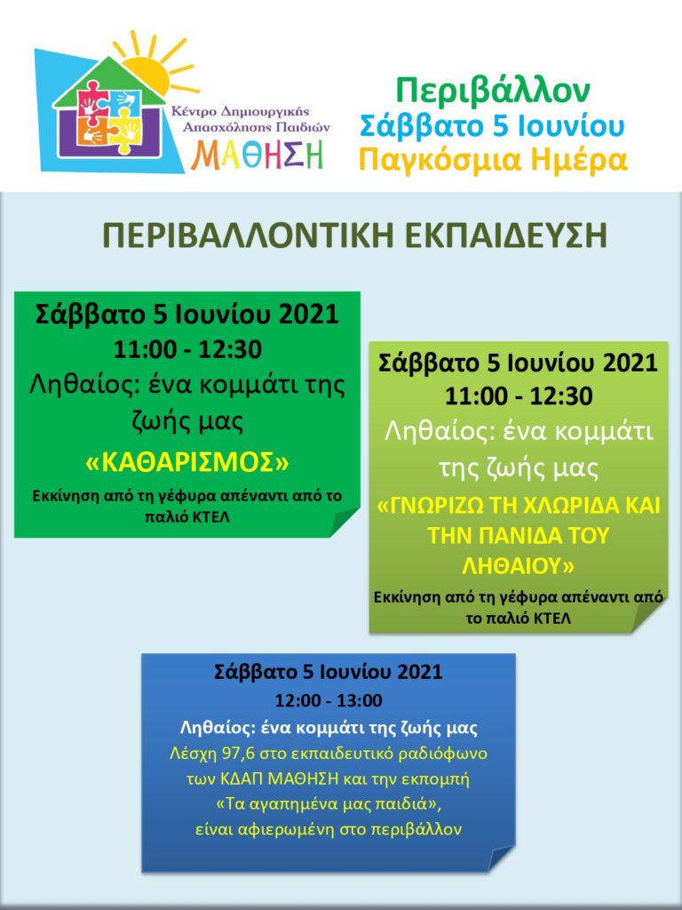 Τα ΚΔΑΠ ΜΑΘΗΣΗ στα πλαίσια της Παγκόσμιας Ημέρας Περιβάλλοντος και των πολύπλευρων δράσεων που απαρτίζουν το πρόγραμμα «ΠΕΡΙΒΑΛΛΟΝΤΙΚΗ ΕΚΠΑΙΔΕΥΣΗ», διοργανώνουν το Σάββατο 5 Ιουνίου 2021 στις όχθες του Ληθαίου ποταμού, ώρα 11:00 – 12:30, καθαρισμό των οχθών του ποταμού καθώς και εκπαιδευτικές δράσεις.