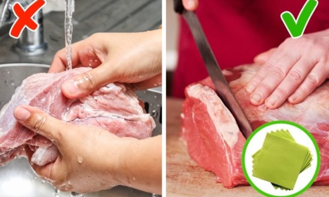 - Κοτόπουλο: Τα βακτήρια στο φρέσκο κοτόπουλο είναι πολύ επικίνδυνα για την υγεία μας. Το πιο γνωστό από όλα είναι η σαλμονέλα. Πολλοί άνθρωποι πιστεύουν ότι το πλύσιμο του κοτόπουλου πριν από το μαγείρεμα βοηθά στην επίλυση αυτού του προβλήματος, αλλά δεν είναι αλήθεια. Όταν πλένετε το κοτόπουλο, το νερό που χρησιμοποιείτε βοηθά τα βακτηρίδια να εξαπλωθούν στα χέρια σας και στον νεροχύτη της κουζίνας. Εάν αρχίσετε να το μαγειρεύετε αμέσως, όλα τα βακτηρίδια θα πεθάνουν. Σύμφωνα με τους καλύτερους σεφ, είναι καλύτερο να βράζετε το κοτόπουλο δύο φορές: μετά το βράσιμο του νερού για πρώτη φορά, θα πρέπει να αλλάξετε το νερό και να συνεχίσετε να βράζετε.
