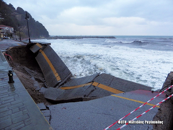 Τεράστια καταστροφή μετρά από χθες το βράδυ η περιοχή του Αη Γιάννη στο Πήλιο. Ο παραλιακός δρόμος από τη μανία των μεγάλων κυμάτων άνοιξε στα δύο. Τα έντονα καιρικά φαινόμενα, με κύριο χαρακτηριστικό τους θυελλώδεις ανέμους και τη δυνατή και μεγάλης διάρκειας βροχόπτωση, άφησαν πίσω τους τεράστια ζημιά.