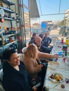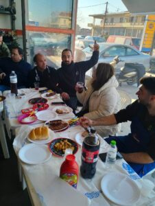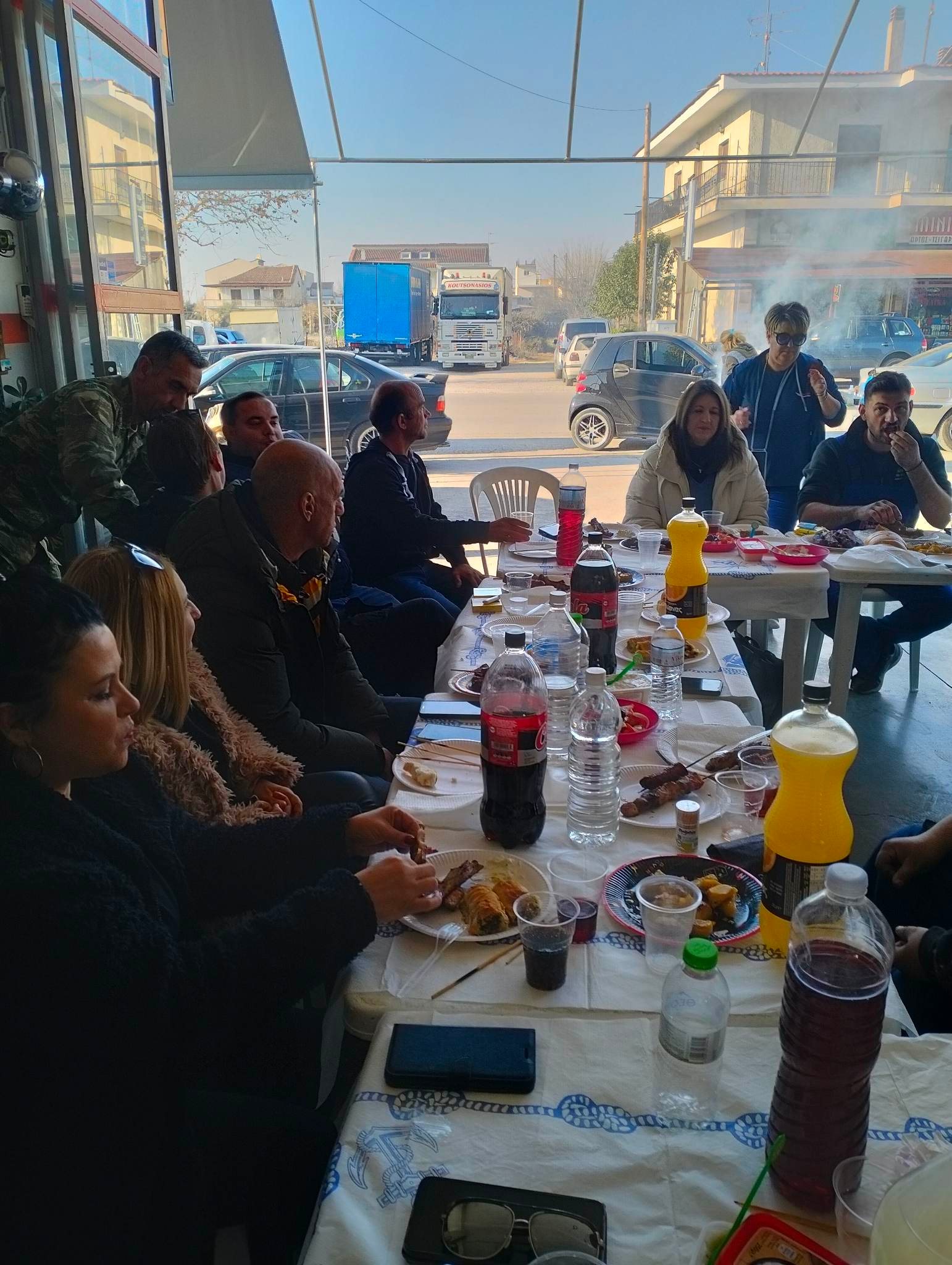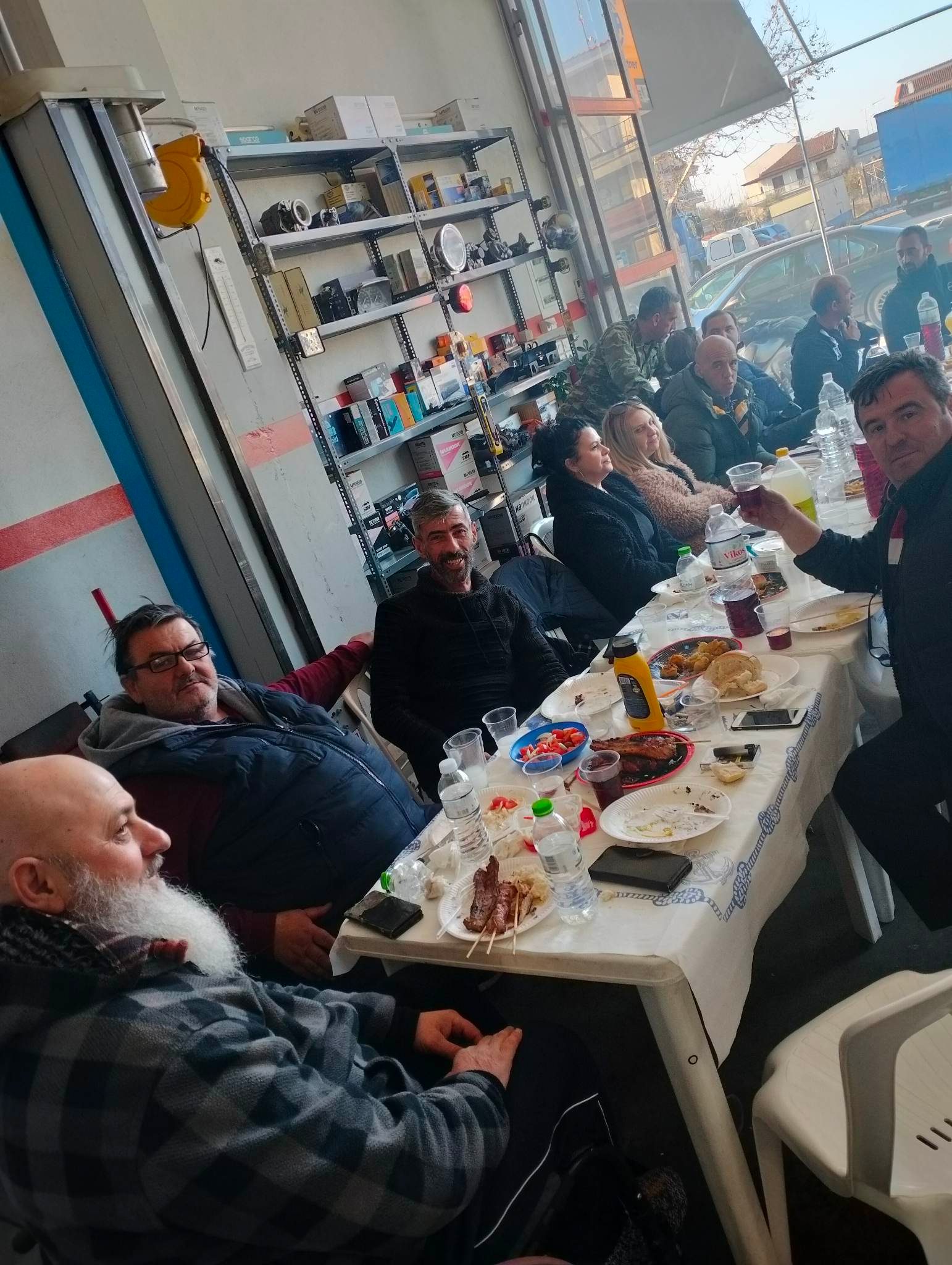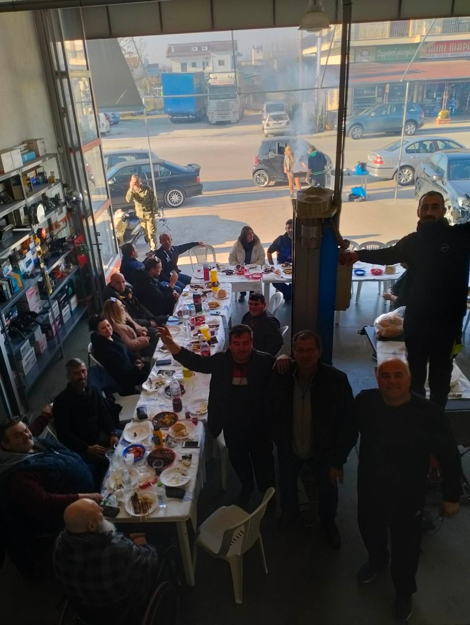 Με προσκεκλημένους συνεργάτες, φίλους και γνωστούς, στήθηκε ένα τεράστιο τραπέζι εντός του συνεργείου και οι συνδαιτημόνες απόλαυσαν μεζέδες και φυσικά τσικνισμένα κρεατικά.