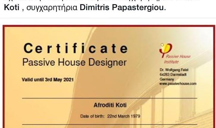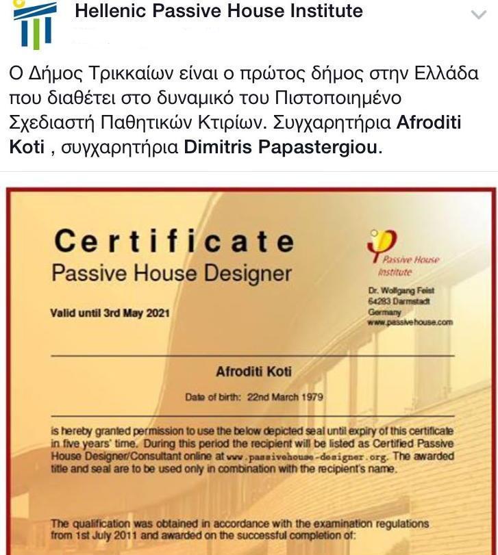 Πιστοποίηση ως Σχεδιαστής Παθητικού Κτηρίου, έλαβε μηχανικός του Δήμου, από το Ελληνικό Ινστιτούτο Παθητικού Κτηρίου. Η πιστοποίηση σημαίνει ότι ενισχύεται η προοπτική του Δήμου για την ενεργειακή αναβάθμιση των κτηρίων. Με κατάλληλες μελέτες και δράσεις, επιδιώκεται η μείωση των εξόδων σε θέματα κατανάλωσης ενέργειας, προς όφελος των δημοτών.