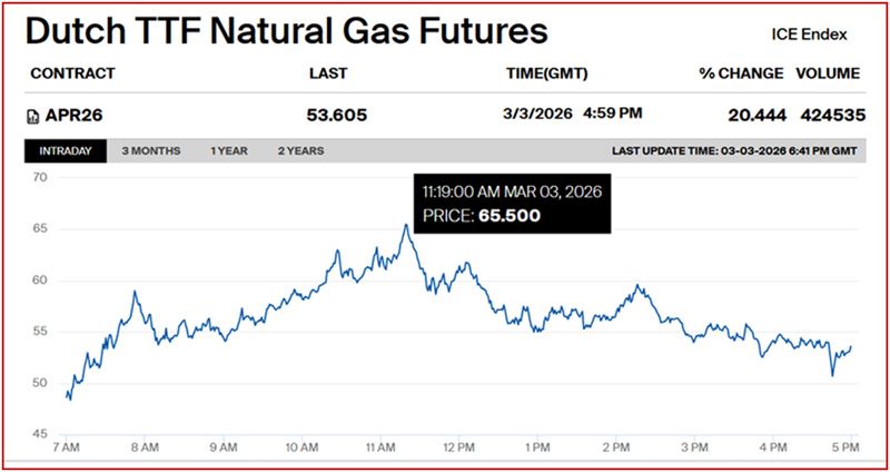 Ο νέος υπερδιπλασιασμός της τιμής του φυσικού αερίου μέσα σε μόλις δυο ημέρες απέδειξε την πλήρη αποτυχία της πολιτικής που αντικατέστησε άρον-άρον τον ΕΛΛΗΝΙΚΟ λιγνίτη με ΕΙΣΑΓΟΜΕΝΟ φυσικό αέριο. Όπως βλέπουμε στο διάγραμμα, στα 65,5€/MWh βρέθηκε το πρωί της Τρίτης 3/3/2026 η τιμή στο Ολλανδικό Χρηματιστήριο, όταν την Παρασκευή 27/2 είχε κλείσει στα 31,96.