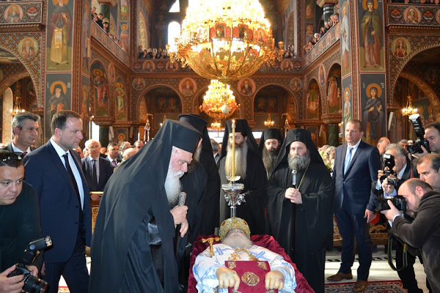 Ο Αρχιεπίσκοπος φθάνοντας στον Μητροπολιτικό Ναό κατευθύνθηκε και προσκύνησε στο σκήνωμα του μακαριστού κυρού Σεραφείμ και ακολούθησε η εξόδιος ακολουθία μετά το πέρας της οποίας τον αποχαιρέτησαν ο Γραμματέας της Ιεράς Συνόδου της Εκκλησίας της Ελλάδος Αρχιμανδρίτης Κλήμης ο οποίος αναφέρθηκε στην προσωπικότητα και τον άριστο χαρακτήρα του Σεβάσμιου Ποιμενάρχη το έργο του οποίου είναι τεράστιο και αναγνωρίζουν άπαντες εκφράζοντας τη βεβαιότητα ότι ο Κύριος τον έχει ήδη κατατάξει εν σκηνές δικαίων.