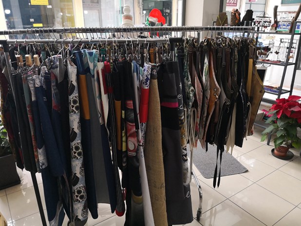 Το κύριο αντικείμενο του εργαστηρίου, είναι οι ποδιές, ωστόσο καθημερινά προκύπτουν ανάγκες με αποτέλεσμα τον τελευταίο χρόνο να ράβουμε, εξηγεί στο Πρακτορείο το τρίτο μέλος της ομάδας Έντα Τάμπα, σακάκια barista /bartender & chef και δερμάτινες θήκες μαχαιριών.