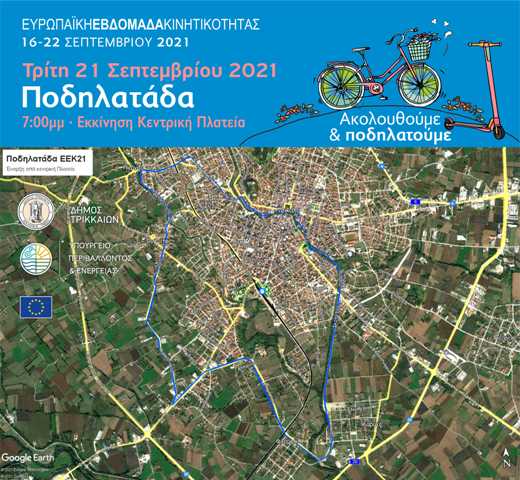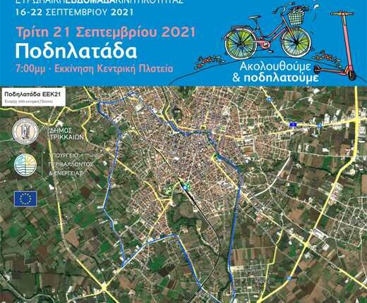 Με βασικό μήνυμα το «Μετακινούμαστε με μέσα φιλικά στο Περιβάλλον. Μένουμε Υγιείς», η φετινή Ευρωπαϊκή Εβδομάδα Κινητικότητας δίνει τον τόνο για μια ακόμη ποδηλατάδα στα Τρίκαλα. Ο Δήμος Τρικκαίων διοργανώνει μια μεγάλη ποδηλατική εξόρμηση, μια βόλτα στη μισή σχεδόν πόλη και τους οικισμούς, με στόχο να μεταφερθεί όσο πιο δυνατά γίνεται το φετινό μήνυμα της Εβδομάδας Κινητικότητας. Η ποδηλατάδα θα πραγματοποιηθεί την Τρίτη 21 Σεπτεμβρίου, στις 19:00, από την κεντρική πλατεία Ηρώων Πολυτεχνείου. Η διαδρομή συμπεριλαμβάνει πορεία προς την οδό Καλαμπάκας και στη συνέχεια προς Πύργο, Πυργετό, Αγία Μονή, Φλαμούλι, Καρυές και μέσω παραποτάμιας διαδρομής, επιστροφή στην κεντρική πλατεία.
