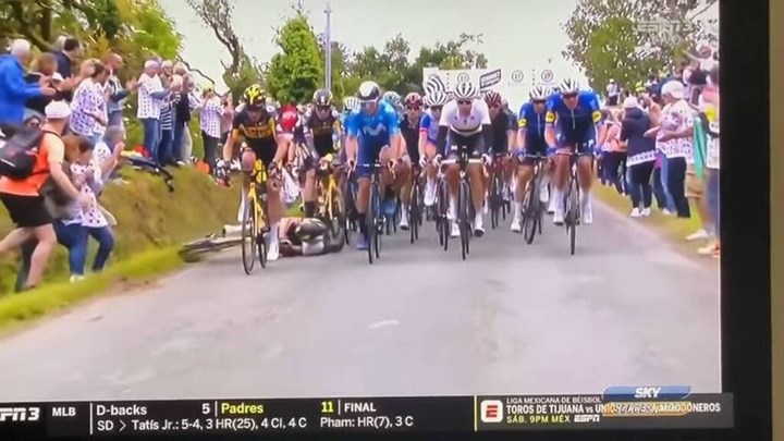 Στο παρακάτω βίντεο θα δείτε ότι αρχικά πέφτει ένας ποδηλάτης που βρισκόταν ακριβώς δίπλα του και στη συνέχεια ακολουθεί το χάος.