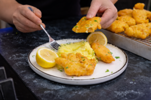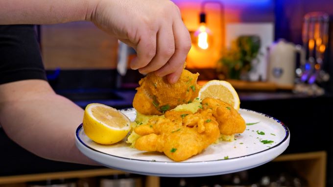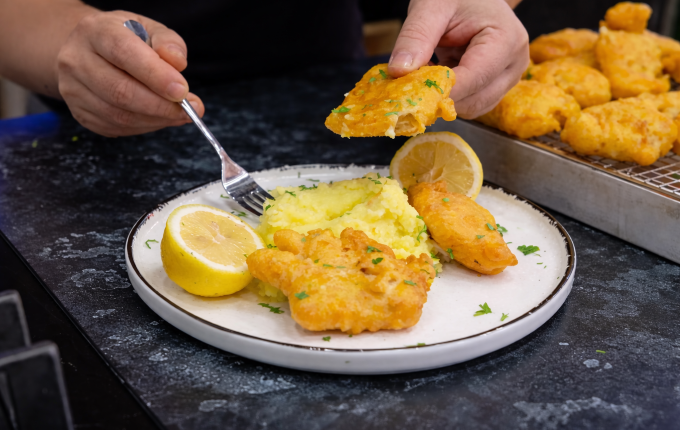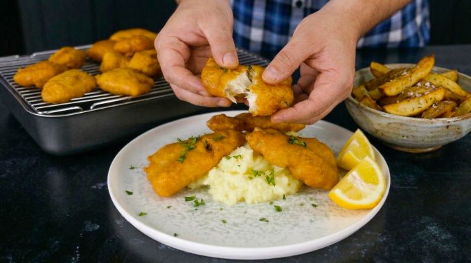 - Πανάρουμε το μπακαλιάρο πρώτα στο αλεύρι έπειτα στο κουρκούτι και τηγανίζουμε σε καυτό λάδι μέχρι να πάρει ένα χρυσαφί χρώμα