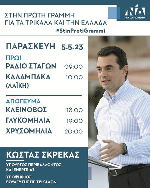 Το πρόγραμμα του Υπουργού Περιβάλλοντος και Ενέργειας και υποψηφίου βουλευτή Π.Ε. Τρικάλων, Κώστα Σκρέκα, για την Παρασκευή 5 Μαΐου είναι το εξής: