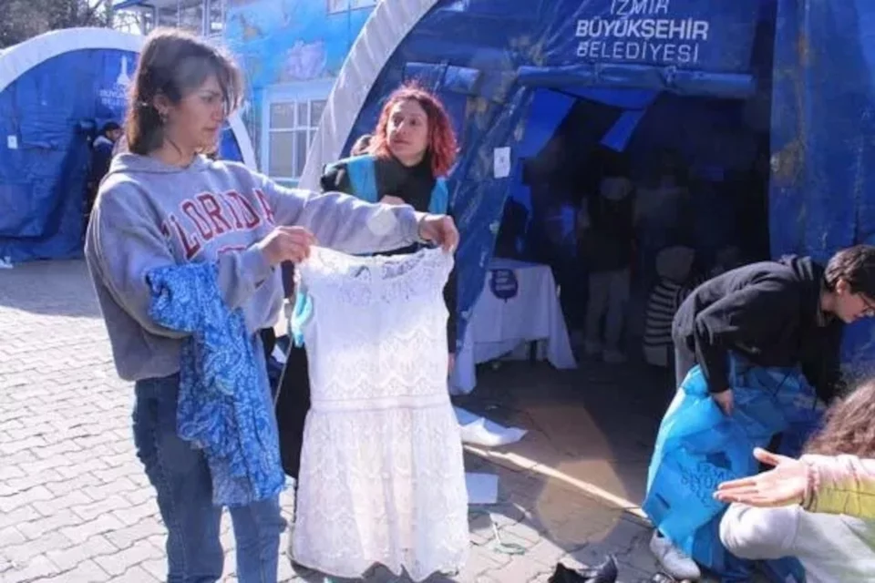 Εθελοντές στη Σμύρνη βρίσκονται νυχθημερόν σε δύο κεντρικά σημεία της πόλης και παραλαμβάνουν μεταχειρισμένα ρούχα, τα οποία στη συνέχεια φορτώνονται σε φορτηγά για να μεταφερθούν στις πληγείσες περιοχές.