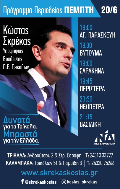 trikaladay.gr / Τοπικά / Το πρόγραμμα επισκέψεων του υποψήφιου βουλευτή της Ν.Δ Κώστα Σκρέκα την Πέμπτη 20/6