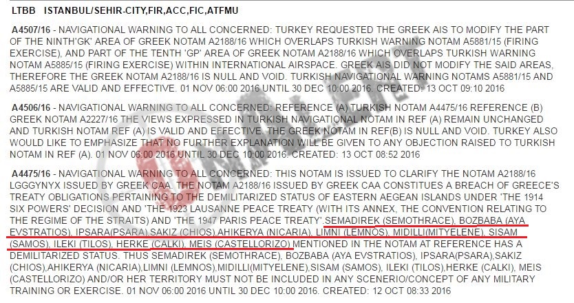 Η Ελλάδα απάντησε για μια ακόμα φορά μέσω της Υπηρεσίας Πολιτικής Αεροπορίας στις τουρκικές αιτιάσεις με τη ΝΟΤΑΜ 2238/16 η οποία αναφέρει τους λόγους που η τουρκική ΝΟΤΑΜ είναι άκυρη.