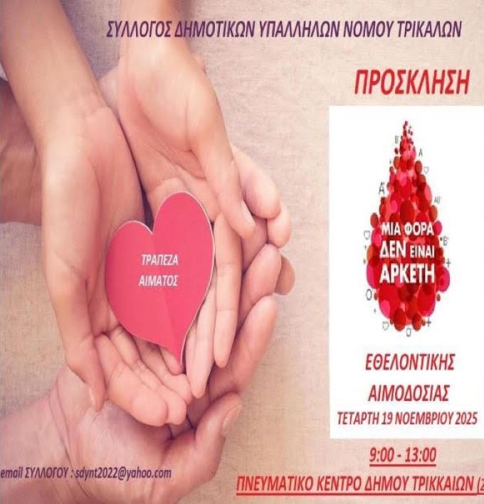 2025από ώρα 9:00 έως 13:00, στο «ΠΝΕΥΜΑΤΙΚΟ ΚΕΝΤΡΟ» του Δήμου Τρικκαίων στον