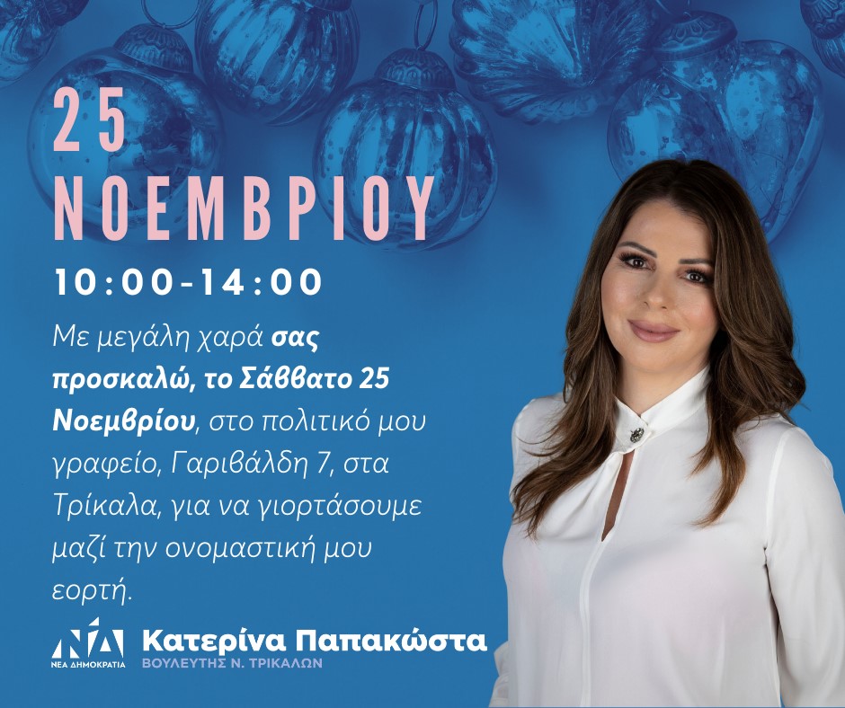 Τις ευχές των Τρικαλινών για την ονομαστική της εορτή θα δεχθεί το Σάββατο 25 Νοεμβρίου η βουλέυτής της ΝΔ Τρικάλων. Κατερίνα Παπακώστα