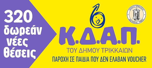 Δωρεάν παροχή σε 320 παιδιά από τον Δήμο Τρικκαίων για τα ΚΔΑΠ που λειτουργούν υπό τη φροντίδα του. Η ΚΕΔΕ είχε ήδη από τον περασμένο Αύγουστο ζητήσει την αύξηση των voucher, προκειμένου να φιλοξενηθούν περισσότερα παιδιά στις δημοτικές αυτές δομές. Πλέον, μετά και τη σχετική απόφαση του Υπουργείου Εσωτερικών ο Δήμος Τρικκαίων ανακοινώνει την ένταξη κι άλλων 320 παιδιών στα ΚΔΑΠ ΣΤΑΘΜΟΣ, ΟΜΟΝΟΙΑ, ΦΡΟΥΡΙΟ. Η επιλογή έγινε από την ΕΕΕΤΑΑ βάσει των κριτηρίων που τέθηκαν από το πρόγραμμα «ΕΝΑΡΜΟΝΙΣΗ ΟΙΚΟΓΕΝΕΙΑΚΗ ΖΩΗΣ».