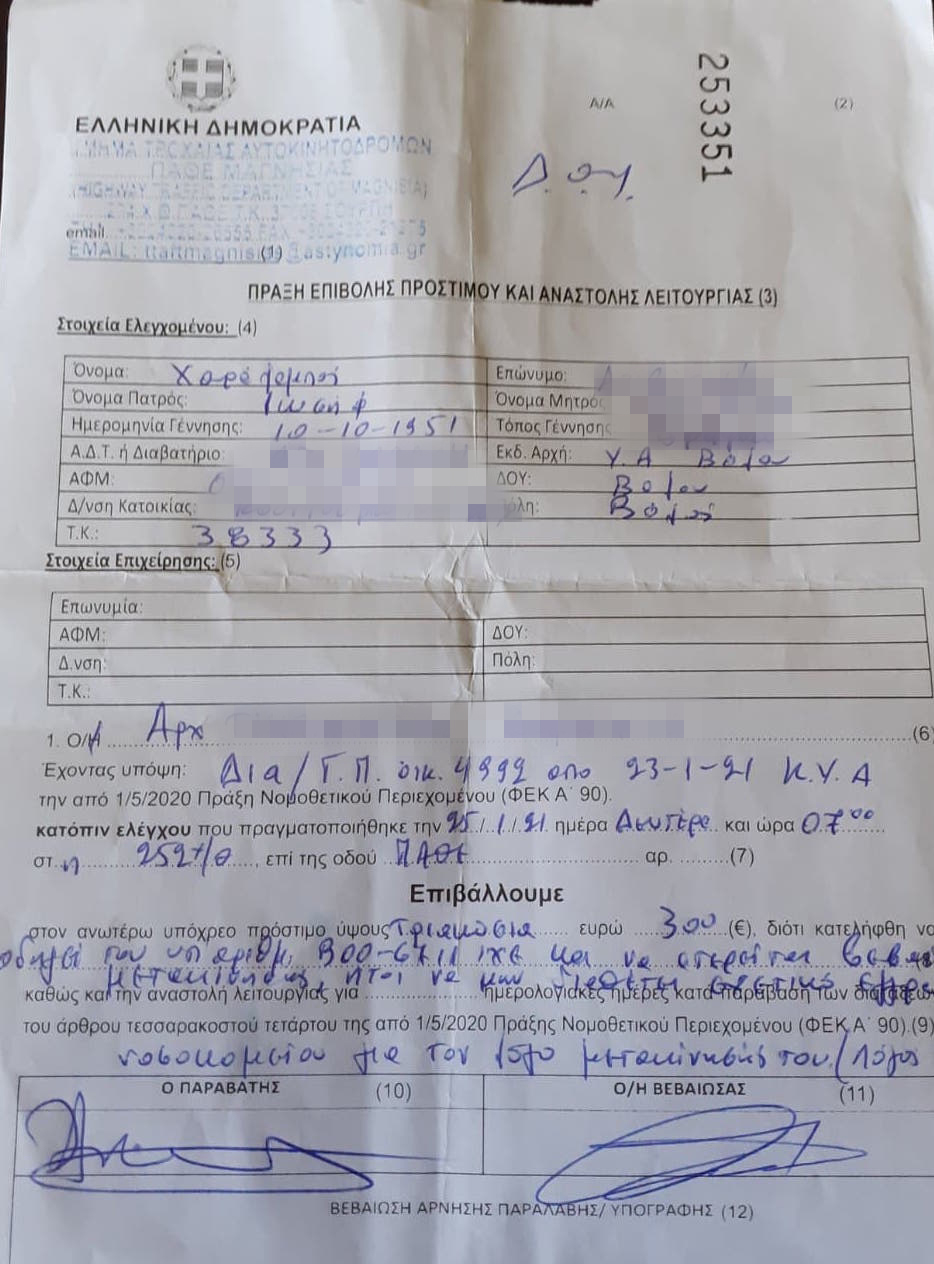 Τα έγγραφα όμως δε φαίνεται να έπεισαν τα όργανα της τάξεως που στις 28 Δεκεμβρίου 2020 και στις 23 Ιανουαρίου 2021 , του βεβαίωσαν πρόστιμα ύψους 300 ευρώ το καθένα!