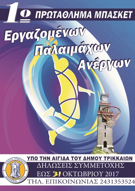 Το Εργασιακό Πρωτάθλημα Μπάσκετ Δήμου Τρικκαίων θα πραγματοποιηθεί από τις 15 Νοεμβρίου 2017. Η κλήρωση θα γίνει στις 9 Νοεμβρίου και οι δηλώσεις συμμετοχής υποβάλλοντα μέχρι 31 Οκτωβρίου 2017.
