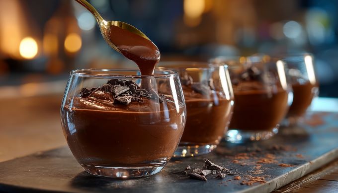 - Μοιράζουμε σε ποτηράκια και γαρνίρουμε με τριμμένη κουβερτούρα .
