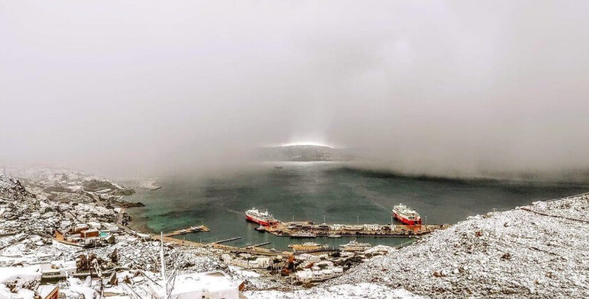 Tο τοπίο σε Σύρο, Τήνο, Νάξο, Αμοργό και Μύκονο είναι κατάλευκο με τα λευκά σπιτάκια να ξεχωρίζουν μετά βίας από το χιονισμένο τοπίο.