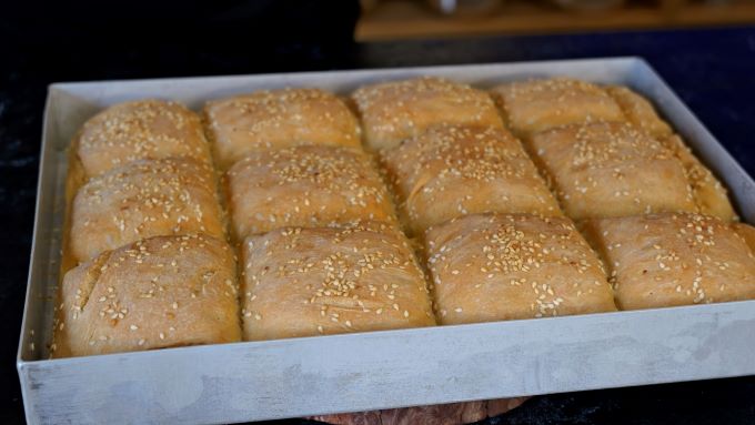 - Ραντίζουμε από πάνω νερό, ρίχνουμε σουσάμι και ψήνουμε σε προθερμασμένο φούρνο στις αντιστάσεις στους 180 c για 35-40 λεπτά.
