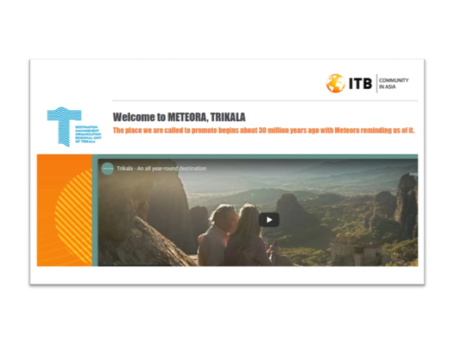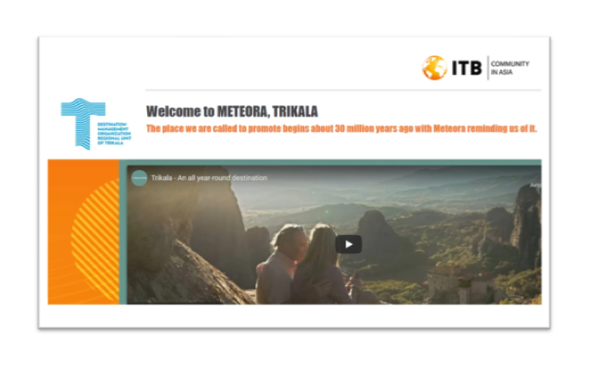 Η προβολή της περιοχής μας πραγματοποιήθηκε με μια ολοκληρωμένη παρουσίαση,στηνψηφιακή πλατφόρμα της έκθεσης, με κείμενα, εικόνες και βίντεο. Η μοναδικότητα των Μετεώρων, η πόλη των Τρικάλων, ο ορεινός όγκος καθώς και οι ενναλακτικές μορφές τουρισμού, οι δραστηριότητες και η γαστρονομία του τόπου μας προβλήθηκαν για πέντε συνεχείς ημέρες σε μια σημαντική αγορά του εξωτερικού<