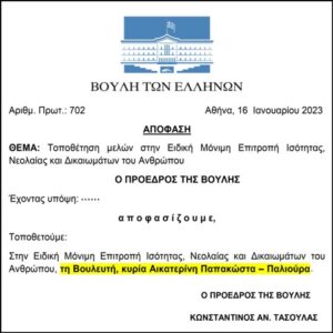 Ψήφος εμπιστοσύνης στην Κατερίνα Παπακώστα από την Κοινοβουλευτική Ομάδα της Νέας Δημοκρατίας