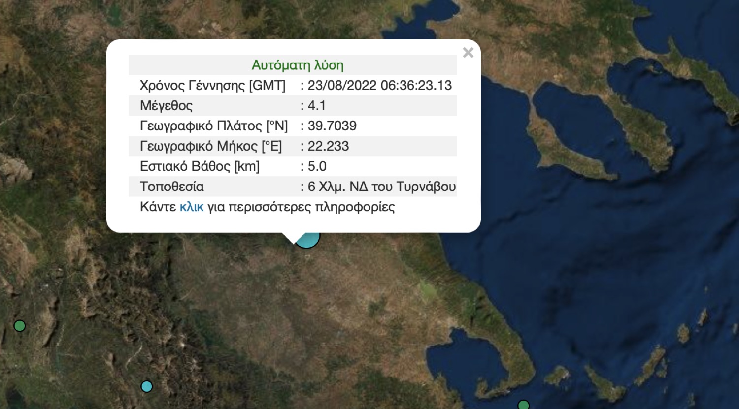 Η δόνηση είχε μεγέθος 4,1 βαθμών της κλίμακας Ρίχτερ με επίκεντρο 6 χιλιόμετρα Νοτιοδυτικά του Τυρνάβου και εστιακό βάθος 5 μέτρα.