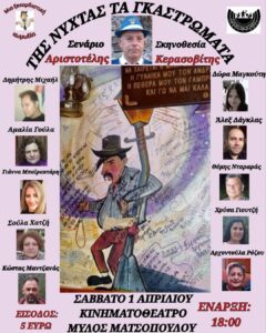 Ο σύλλογος φίλων τέχνης και θεάτρου “ΠΟΛΥΜΥΘΟΝ” σας παρουσιάζει την ξεκαρδιστική κωμωδία του Αριστοτέλη Κερασοβίτη “ΤΗΣ ΝΎΧΤΑΣ ΤΑ ΓΚΑΣΤΡΩΜΑΤΑ” το Σάββατο 1η Απριλίου στο Κινηματοθέατρο του Μύλου Ματσόπουλου.
