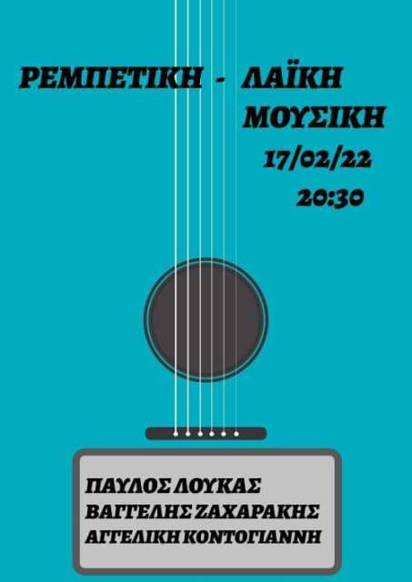 Την Πέμπτη 17/02/22 ρεμπέτικη – λαϊκή μουσική με τον Παύλο Λουκά , Βαγγέλη Ζαχαράκη & την Αγγελική Κοντογιάννη !