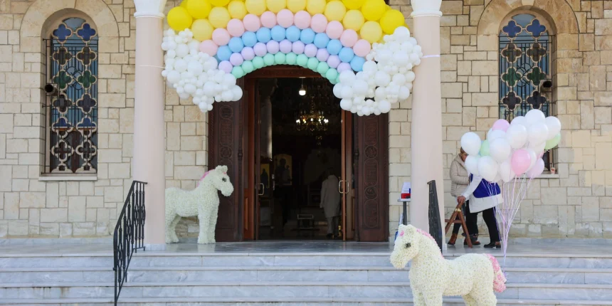 Μπαλόνια με μηνύματα για την Ραφαέλα και ένα μεγάλο ουράνιο τόξο στόλιζαν το ναό. Συγκινημένοι οι φίλοι της τόνισαν ότι «μπόρα ήταν και πέρασε».