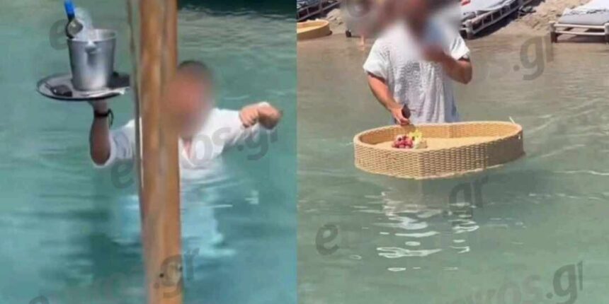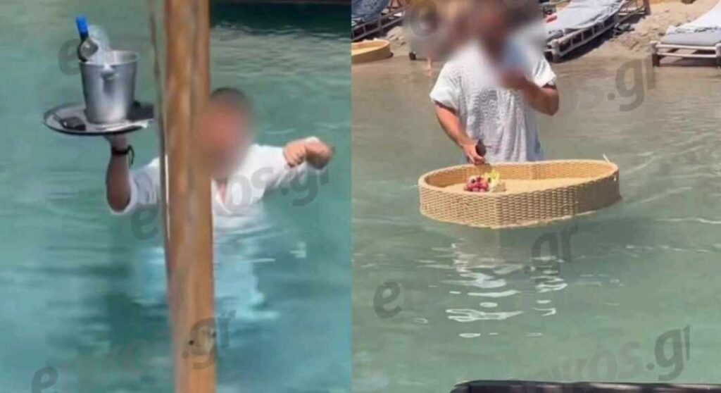 Σε ανάρτηση που έκανε πριν από 6 μέρες σε γνωστό μέσο κοινωνικής δικτύωσης, ένας τουρίστας που επισκέφθηκε το νησί, φαίνεται ο σερβιτόρος να παραδίδει την παραγγελία, είτε κρατώντας τον δίσκο στα χέρια, είτε αφήνοντάς τον να επιπλέει μέσα στην θάλασσα, με το νερό να φτάνει σχεδόν στο στήθος του.