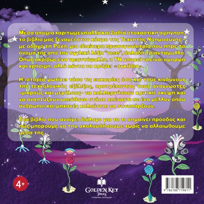 Μέσα από μια χαριτωμένη αλλά και βαθιά στοχαστική αφήγηση, ο αναγνώστης ταξιδεύει στον κόσμο της Τεχνητής Νοημοσύνης με οδηγό τη Ρόζη — μια ιδιαίτερη πρωταγωνίστρια που πήρε το όνομά της από τη λέξη rose, δηλαδή «τριαντάφυλλο». Όπως ακριβώς κι ένα τριαντάφυλλο, έτσι και η Ρόζη —και κατ’ επέκταση η ίδια η τεχνητή νοημοσύνη— μπορεί να είναι όμορφη και χρήσιμη, αλλά να κρύβει και «αγκάθια». Η ιστορία φωτίζει τόσο τις ευκαιρίες όσο και τους κινδύνους της τεχνολογικής εξέλιξης, προτρέποντας μικρούς και μεγάλους να καλλιεργήσουν κριτική σκέψη, ηθική συνείδηση και υπεύθυνη στάση απέναντι σε ένα μέλλον όπου ίσως άνθρωποι και μηχανές θα κληθούν να συνυπάρξουν αρμονικά.