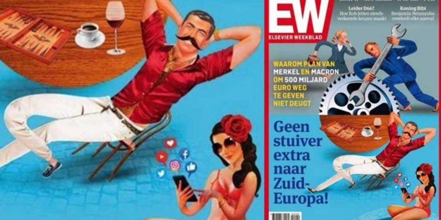Στο εξώφυλλο του περιοδικού Elsevier, με κυκλοφορία 66.000 φύλλων, εικονίζονται οι «τεμπέληδες» κάτοικοι της Νότιας Ευρώπης, με έναν άνδρα με μουστάκι να πίνει αραχτός καφέ και δίπλα του να υπάρχει ένα ποτήρι κρασί και ένα τάβλι και μια γυναίκα με μπικίνι να χαζεύει -με τα πόδια της βουτηγμένα στην πισίνα- στο κινητό της τηλέφωνο. Την ίδια ώρα, στο επάνω μέρος του εξωφύλλου εικονίζονται δύο ξανθοί Ολλανδοί με εργατική φόρμα και κοστούμι να κινούν τα χρηματοοικονομικά γρανάζια της Ευρωπαϊκής Ένωσης.