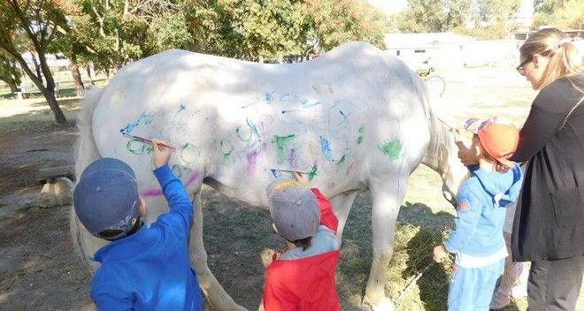 Ειδικότερα, όπως φαίνεται σε φωτογραφίες που κυκλοφορούν σε μέσα κοινωνικής δικτύωσης, παιδιά του παιδικού σταθμού “Κοπερτί” ζωγράφισαν πάνω στα σώματα αλόγων υπό την επίβλεψη των παιδαγωγών τους.