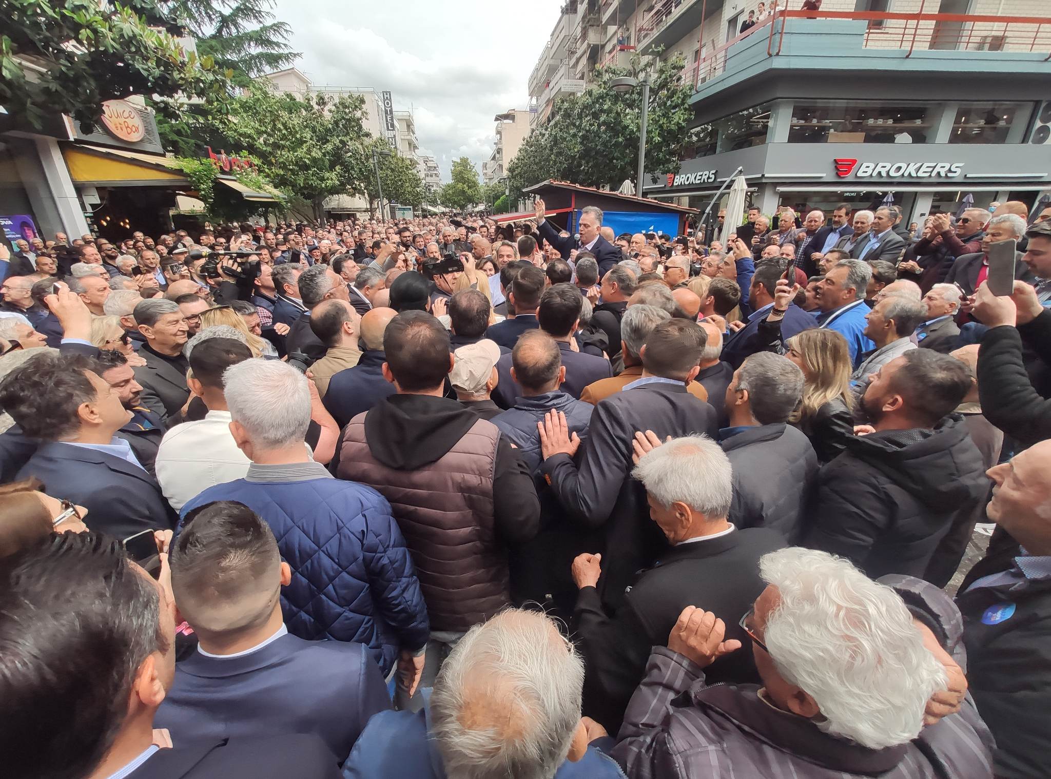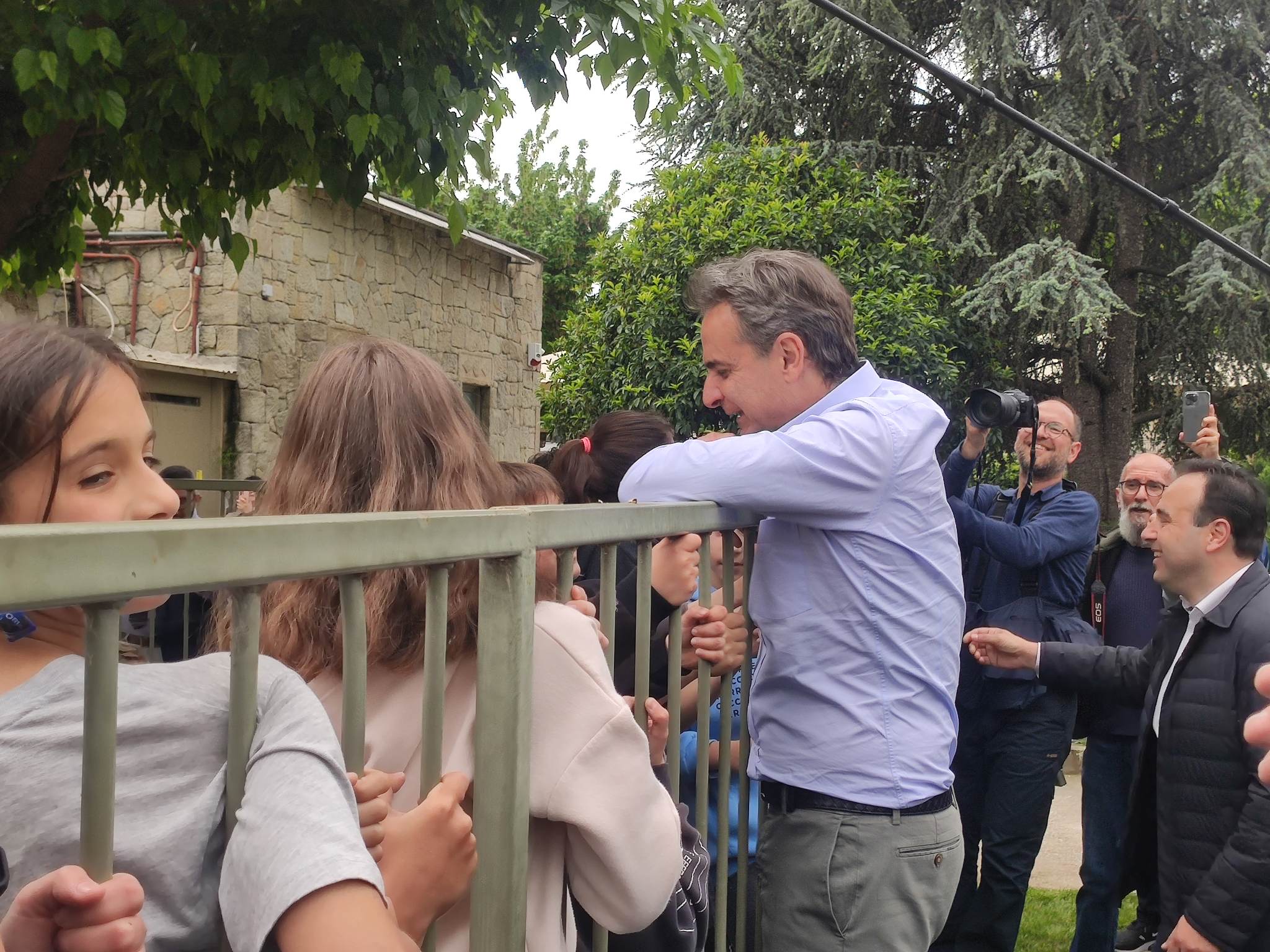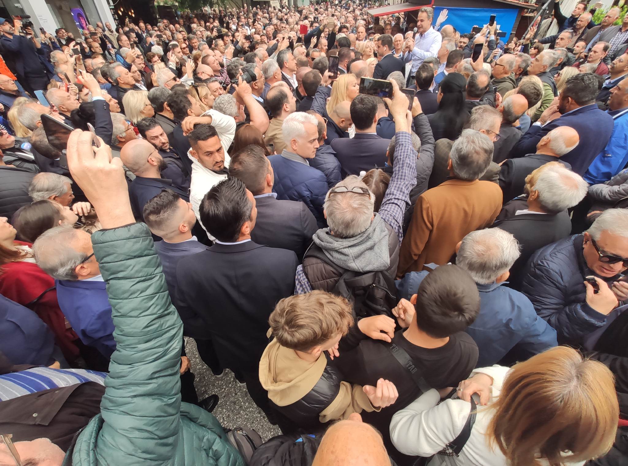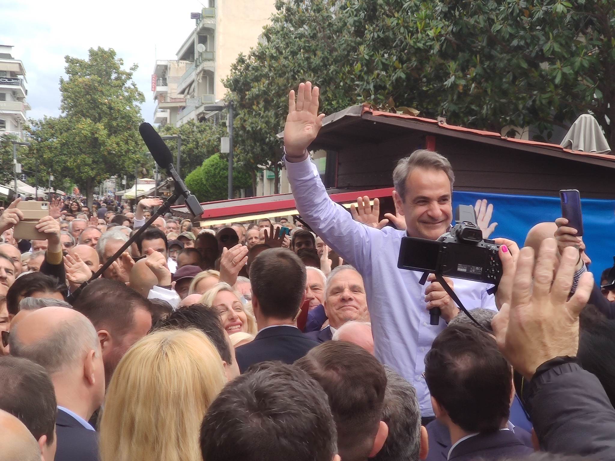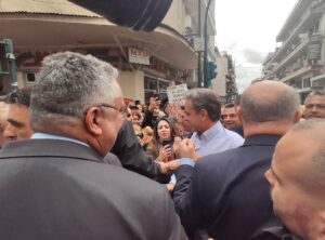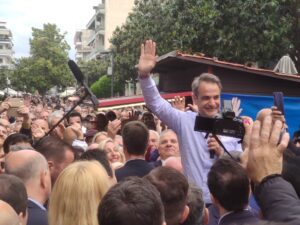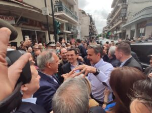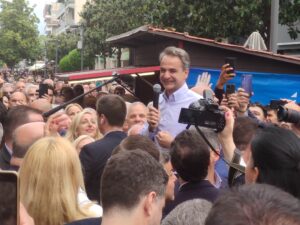 Ο κ. Μητσοτάκης με καθυστέρηση περίπου μιας ώρας αφίχθη στις 12 το μεσημέρι στην Ασκληπιού στο προεκλογικό περίπτερο της Ν.Δ όπου έτυχε θερμής υποδοχής από τους συγκεντρωμένους.