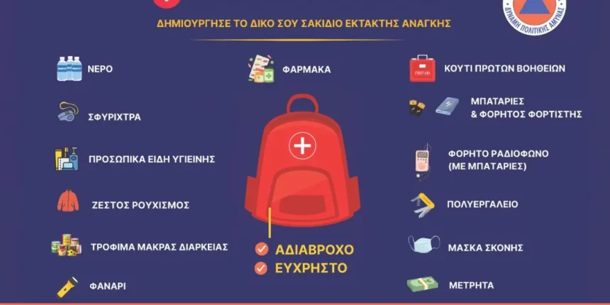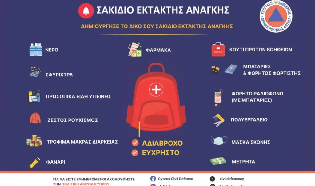 Για παν ενδεχόμενο προετοιμάζεται η Κύπρος, καλώντας τους πολίτες να δημιουργήσουν προληπτικά το δικό τους σακίδιο έκτακτης ανάγκης με τα απαραίτητα προϊόντα, το οποίο θα είναι εύκολα μεταφερόμενο σε περίπτωση που δοθούν σχετικές οδηγίες από τις αρμόδιες Αρχές.Το σακίδιο θα πρέπει να περιλαμβάνει τα βασικά είδη που θα χρειαστούν σε περίπτωση εκκένωσης ή καταφυγίου, όπως τρόφιμα, νερό, πρώτες βοήθειες, καθώς και προσωπικά έγγραφα.
