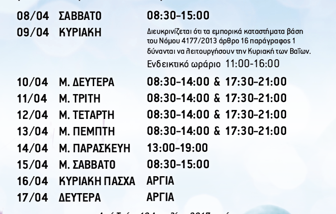 09/04/2017 Τα εμπορικά καταστήματα βάσει του νόμου 4177/2013 άρθρο 16 παρ.1 δύναται να λειτουργήσουν την Κυριακή των Βαΐων.
