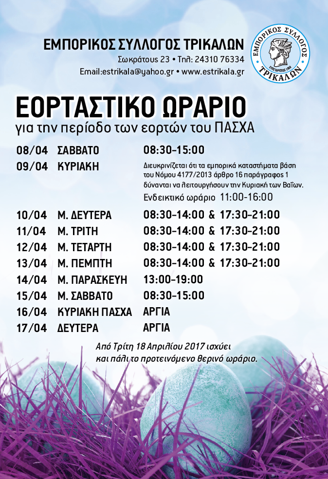 Ο Εμπορικός Σύλλογος Τρικάλων ενημερώνει τους συναδέλφους και το καταναλωτικό κοινό ότι το προτεινόμενο εορταστικό ωράριο των καταστημάτων για την περίοδο του Πάσχα, από το Σάββατο 08 Απριλίου 2017 έως την Δευτέρα 17 Απριλίου 2017, έχει ως εξής: