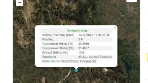 Η σεισμική δόνηση είχε ένταση 3,9 Ρίχτερ και εστιακό βάθος 10km , ενώ η εστία ήταν 40km ΝΔ των Τρικάλων