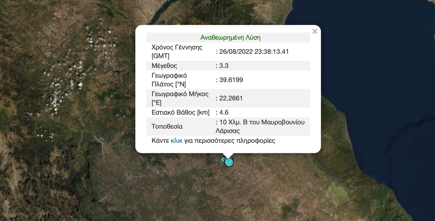Σεισμική δόνηση μεγέθους 3,3 βαθμών της Κλίμακας Ρίχτερ έλαβε χώρα τα ξημερώματα του Σαββάτου, λίγα χιλιόμετρα έξω από τη Λάρισα.