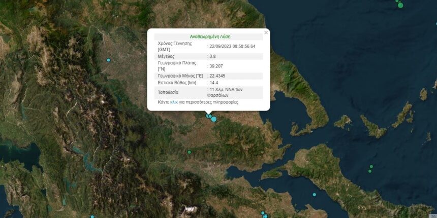 Σεισμός μεγέθους 3,8 βαθμών της κλίμακας Ρίχτερ σημειώθηκε στη Θεσσαλία. Σύμφωνα με το Γεωδυναμικό Ινστιτούτο, ο σεισμός είχε επίκεντρο περιοχή 11 χιλιόμετρα νοτιοανατολικά των Φαρσάλων.