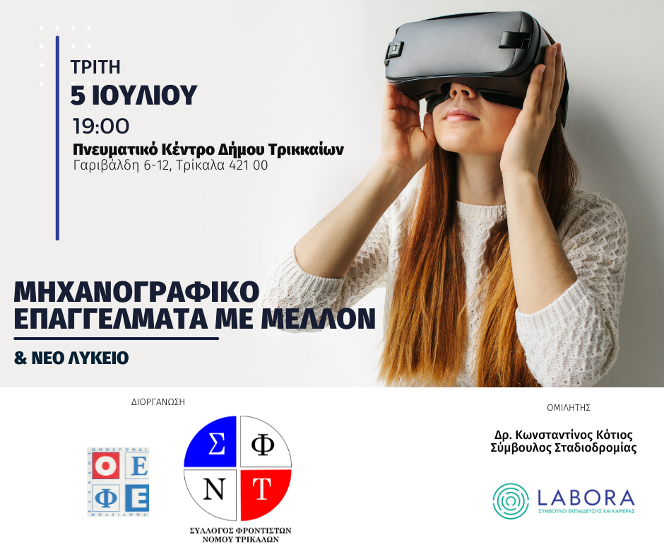 Ο Σύλλογος Φροντιστών Νομού Τρικάλων στα πλαίσια της έγκαιρης και έγκυρης ενημέρωσης των μαθητών και των γονέων διοργανώνει ημερίδα επαγγελματικού προσανατολισμού με τίτλο: ΜΗΧΑΝΟΓΡΑΦΙΚΟ, ΕΠΑΓΓΕΛΜΑΤΑ ΜΕ ΜΕΛΛΟΝ ΚΑΙ ΝΕΟ ΛΥΚΕΙΟ σε συνεργασία με την επιστημονική ομάδα της LABORA Σύμβουλοι Εκπαίδευσης (www.labora.gr). Ομιλητής ο Δρ. Κότιος Κωνσταντίνος, Σύμβουλος Εκπαίδευσης και Καριέρας, συγγραφέας και ιδρυτής της LABORA.