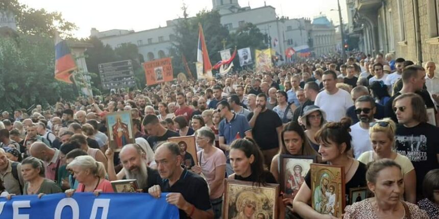 Οι συμμετέχοντες προχθές Κυριακή στο συλλαλητήριο «Λιτανεία για τη σωτηρία της Σερβίας», που είναι αφοσιωμένοι στις παραδοσιακές αξίες και εναντίον της προώθησης των δικαιωμάτων των LGBT και των παρελάσεων, πέρασαν από τους κεντρικούς δρόμους του Βελιγραδίου μία ημέρα μετά την ανακοίνωση ακύρωσης του Europride από τον πρόεδρο της Σερβίας Αλεξάνταρ Βούτσιτς.